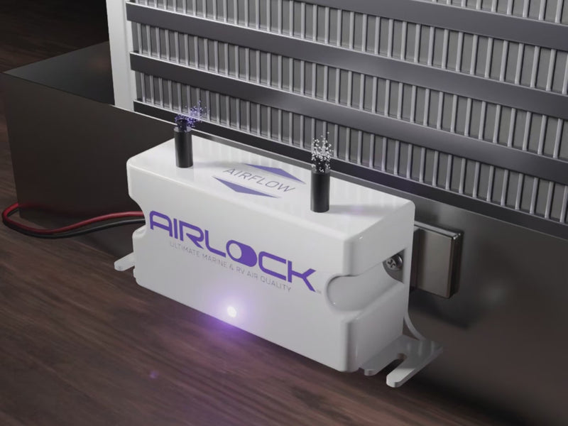 AIRLOCK One installs into your AC system and treats air before it reaches your vents. Bipolar ionization makes odor molecules and pollutants cluster and drop out of the air, so your whole cabin stays fresh. One unit per AC. Whole-boat coverage.