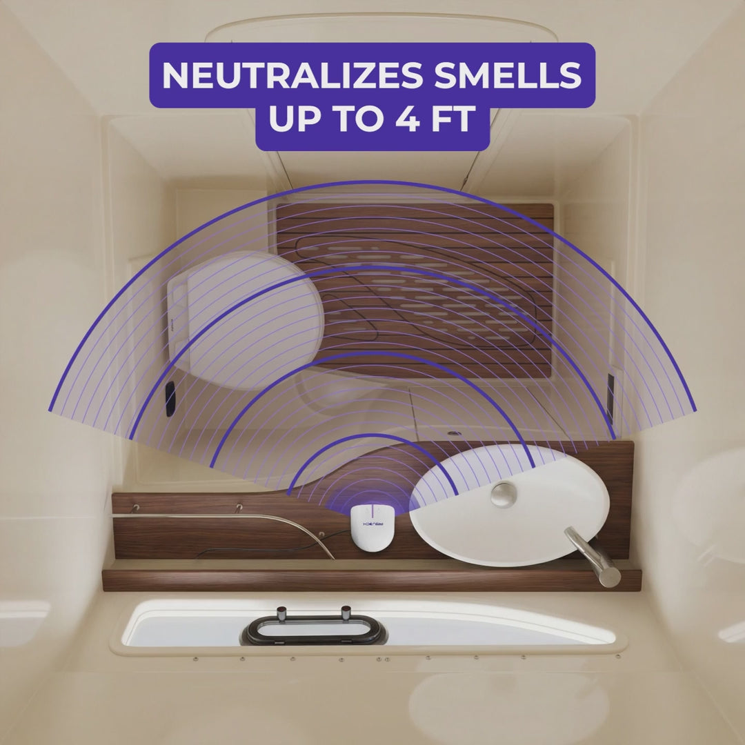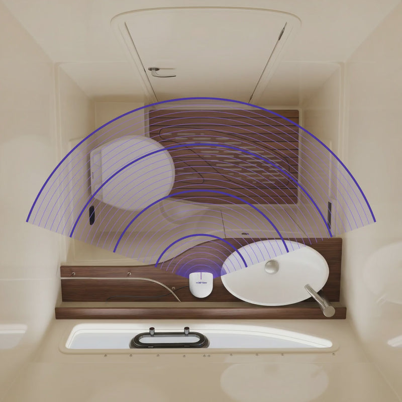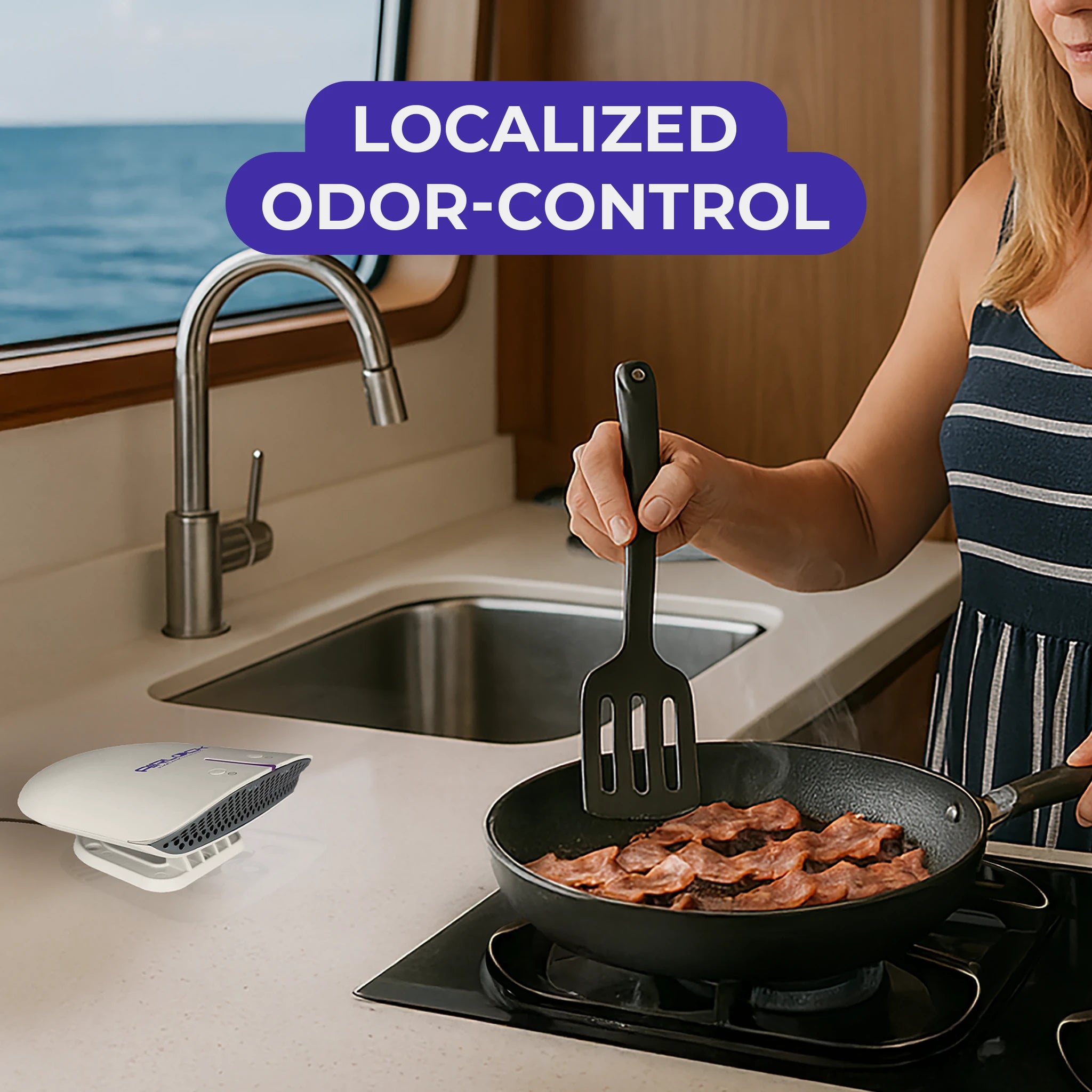 Voyage is the backup: a compact, plug-in purifier for heads, galleys, and other tight spots. Use it where air doesn’t move, when the AC isn’t running, and between trips to keep zones from going stale.