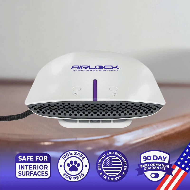 AIRLOCK Voyage pulls in ambient air from your boat's interior using a built-in fan. This ensures that even stale, unmoving air in tight spaces gets drawn into the purification cycle — no HVAC required.