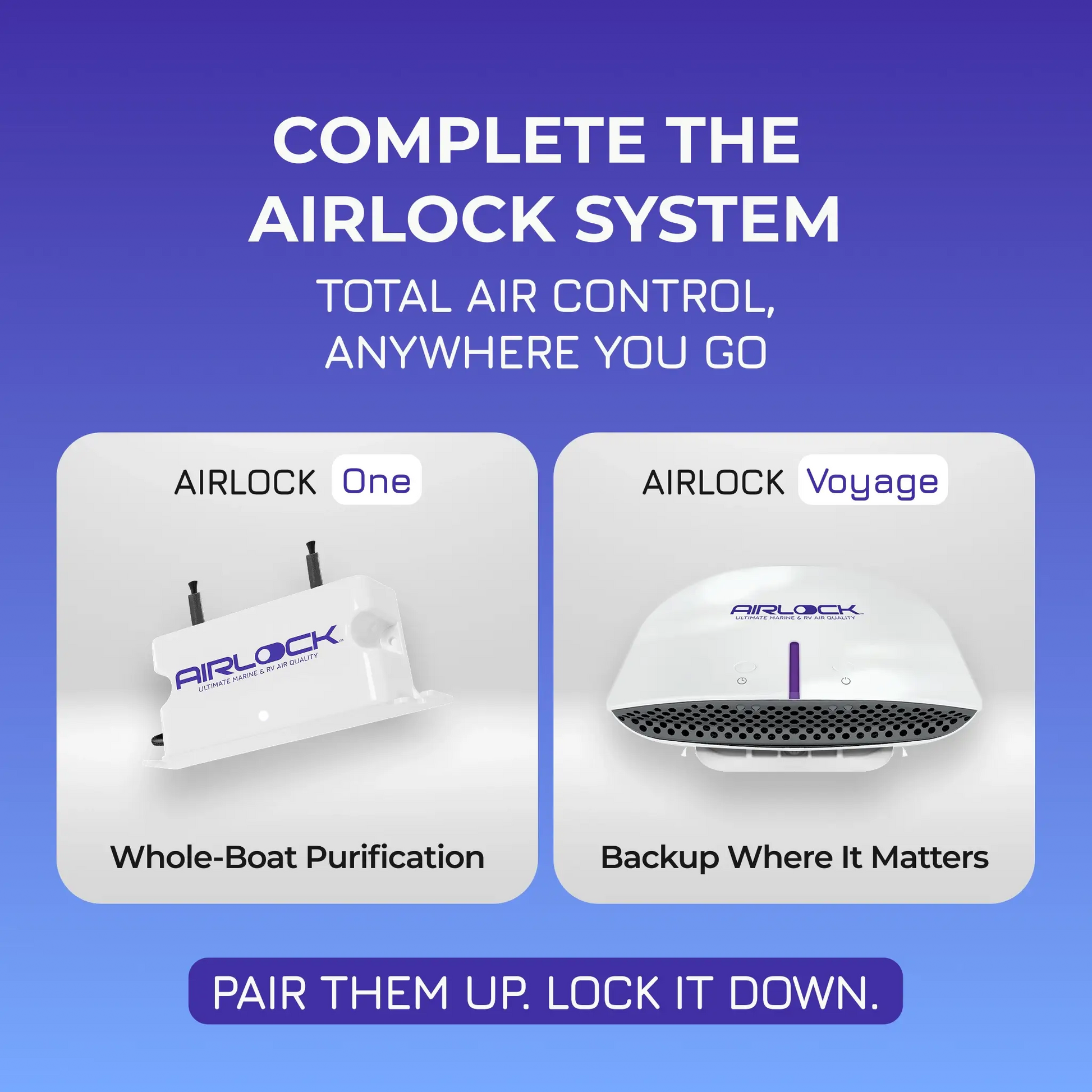 While AIRLOCK One works along your AC system for full, powerful coverage, AIRLOCK Voyage adds real-time, localized odor control for tight spaces or off-season use.