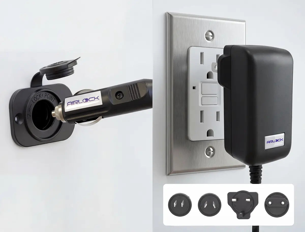 Voyage comes with both a 12V DC car plug and a 100 to 240V AC adapter, so it works with international outlets and runs the same whether you are on shore power, at a US campsite, or traveling abroad.