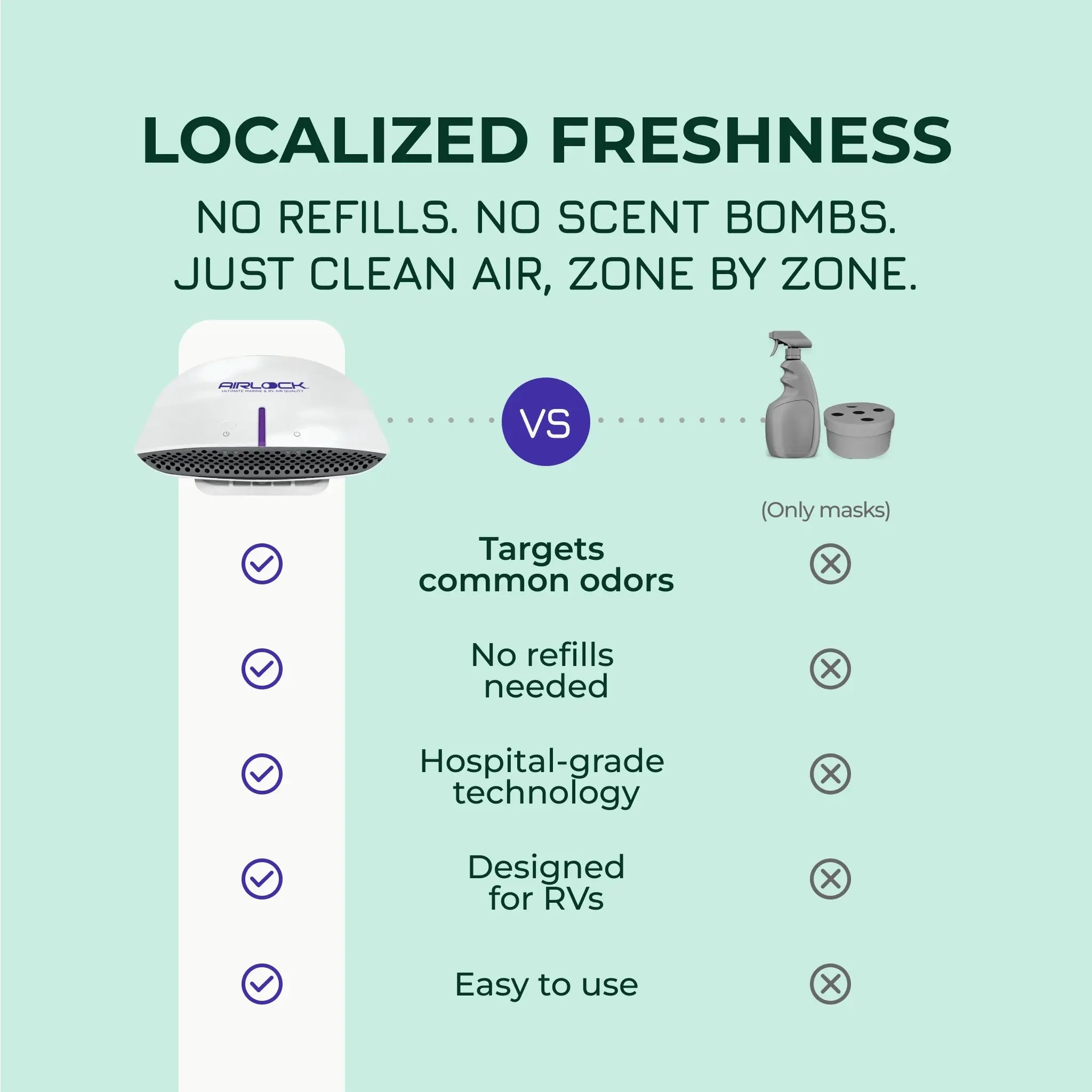 No. AIRLOCK One is the more powerful, system-installed solution—it installs in your RV’s AC and treats air before it hits the vents, tackling set-in odors throughout the system.